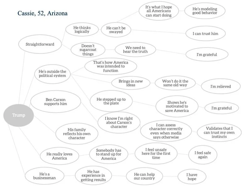 We first conducted hour-long, in-depth “Laddering” interviews based on the Means-End Theory (Gutman, 1982), with 16 female supporters of Donald Trump. The interviewees were recruited from a discrete pool of self-identified women supporters of Trump (47,081) who were “followers” of the “Women for Donald Trump” Facebook page, of whom we spoke with those meeting the following criteria: voted for Trump in the primary (if a primary was in fact held), voted for Trump in the general, and rated their support for him as a "7."